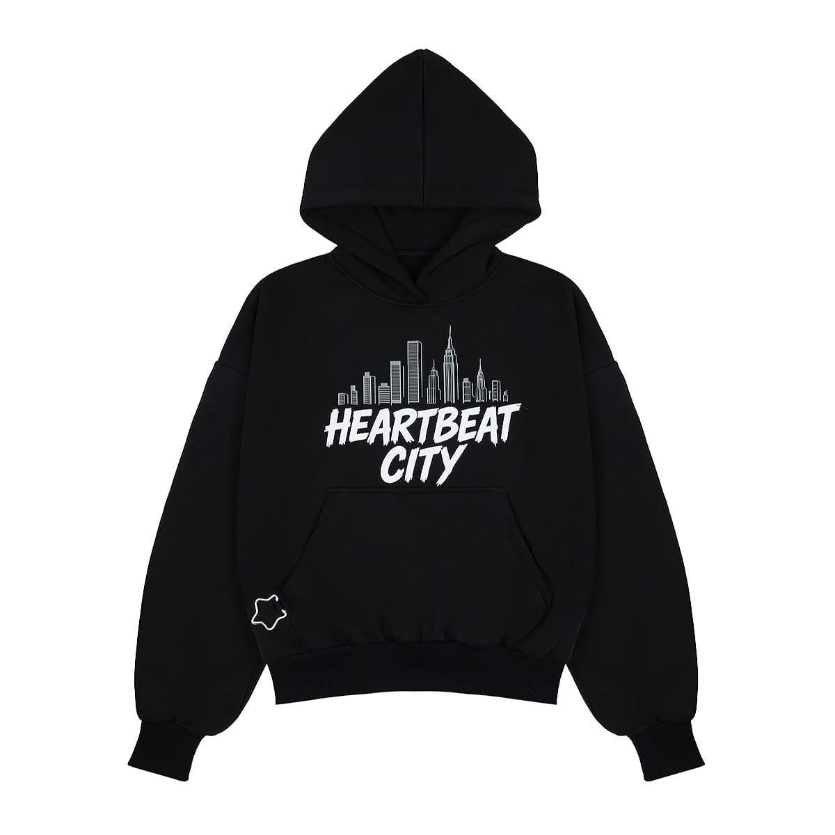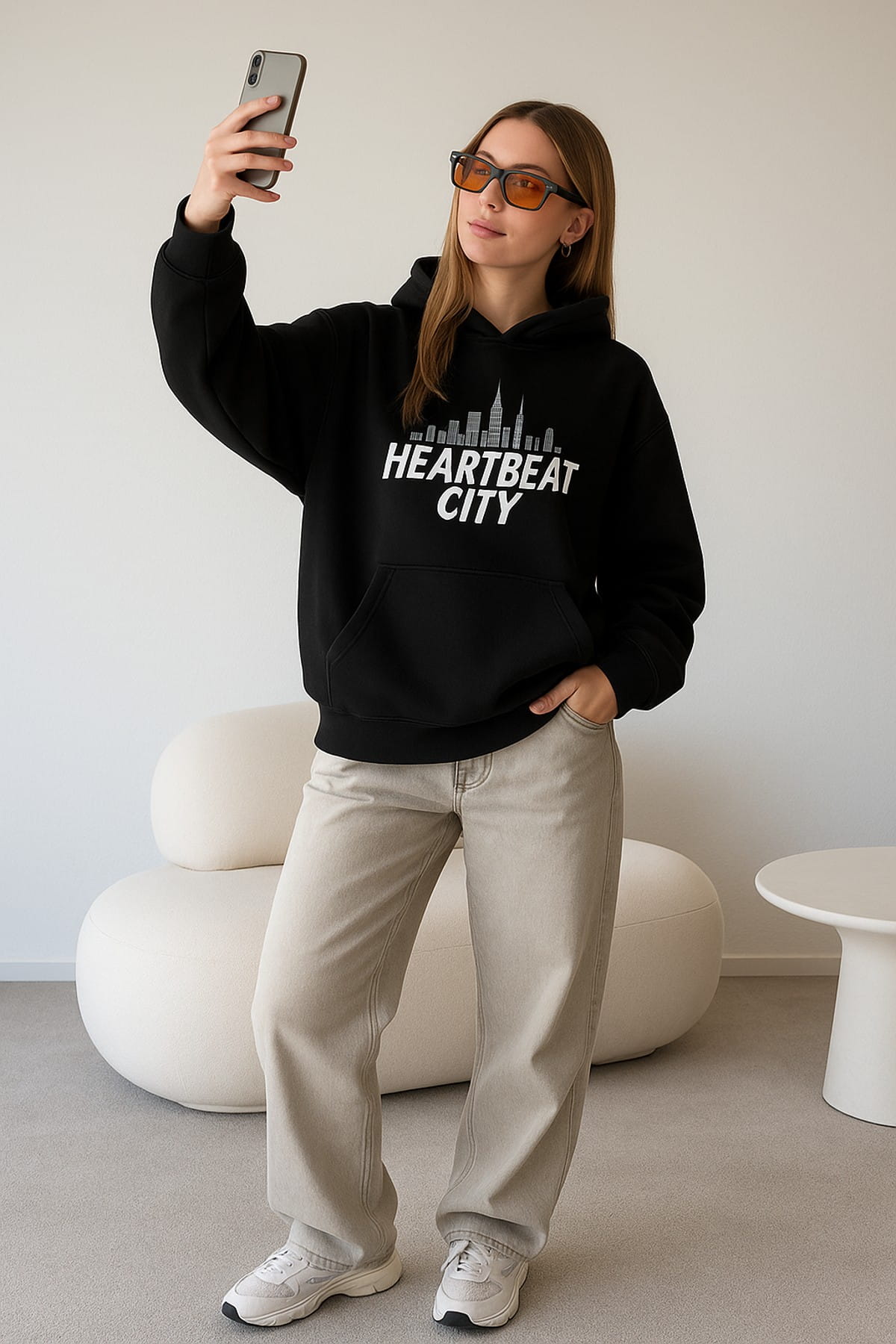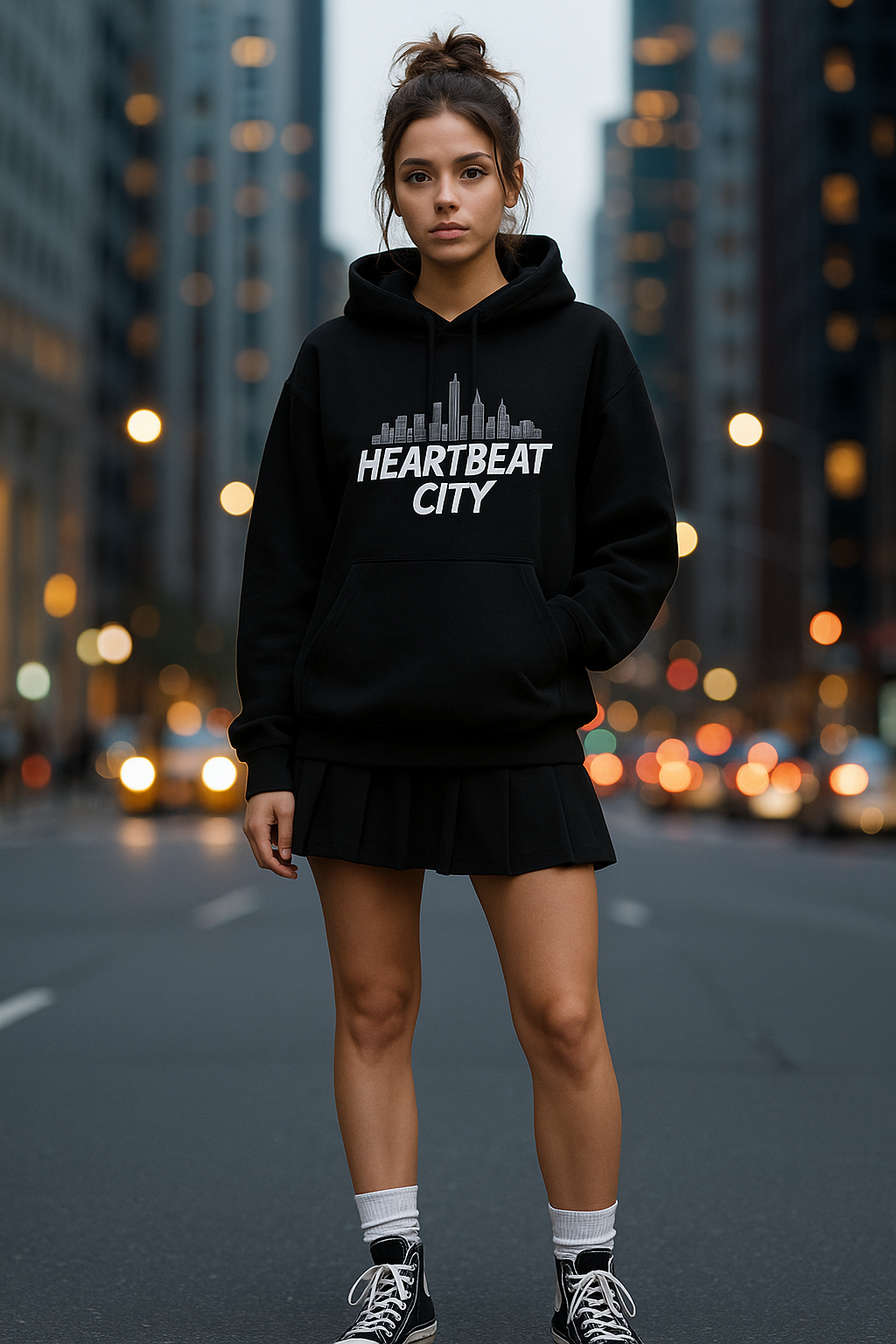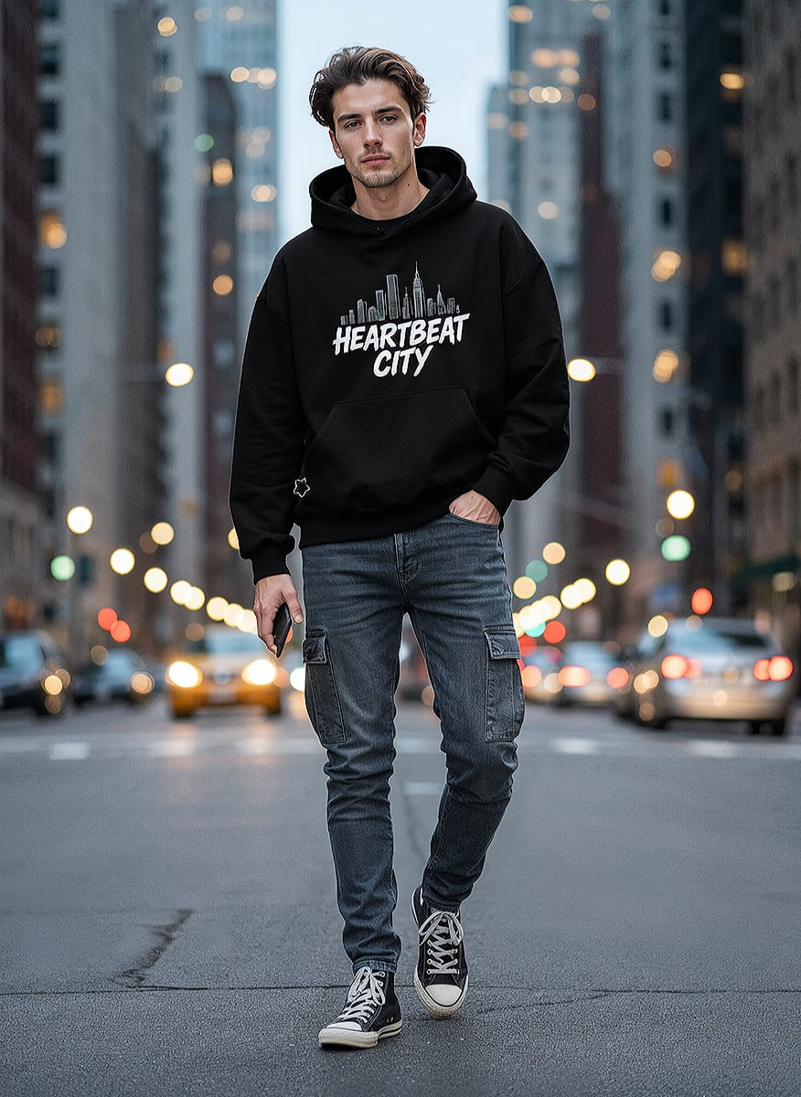 Odkryj miejską energię w najczystszej formie. Czarna bluza HEARTBEAT CITY to połączenie nowoczesnego stylu i komfortu premium.